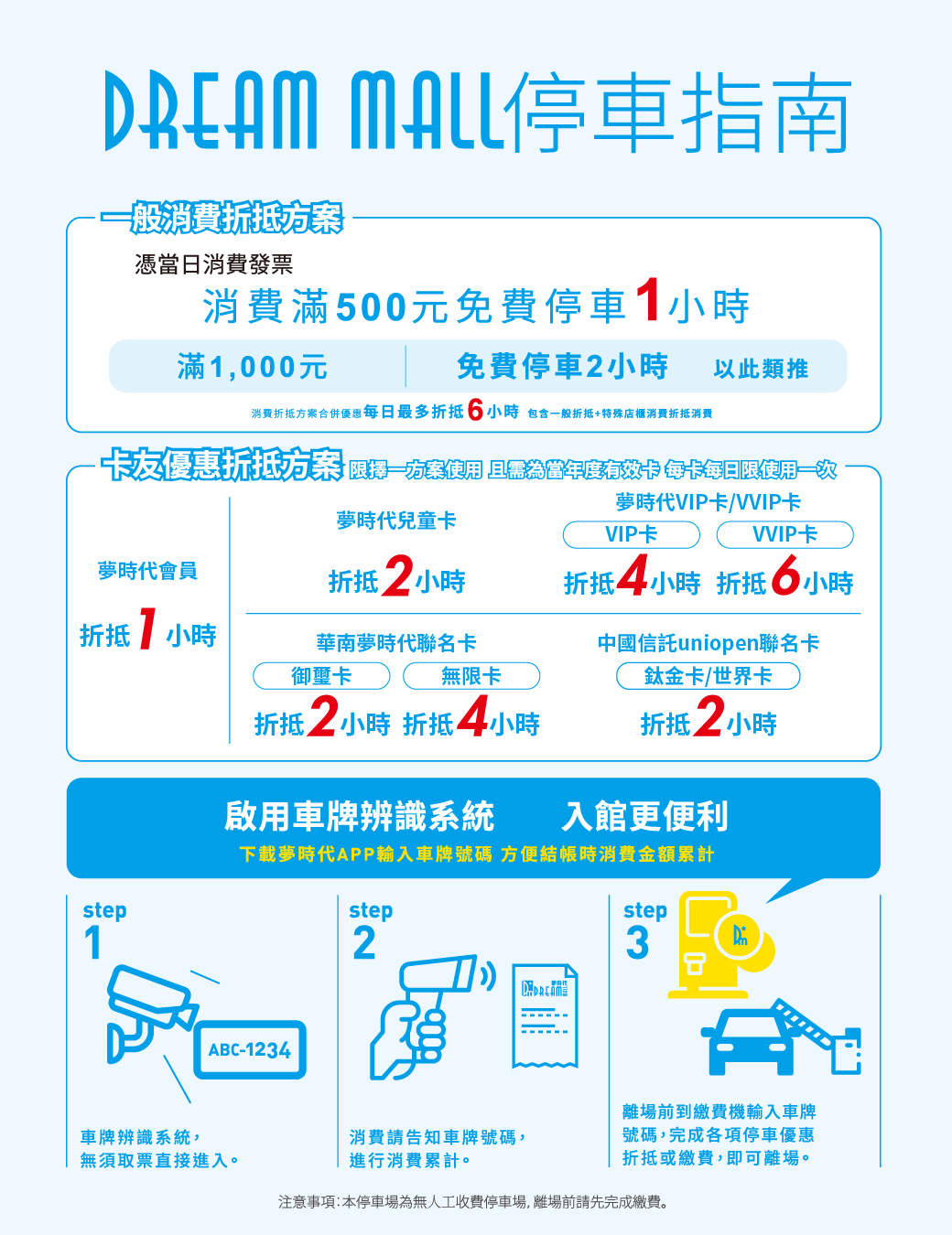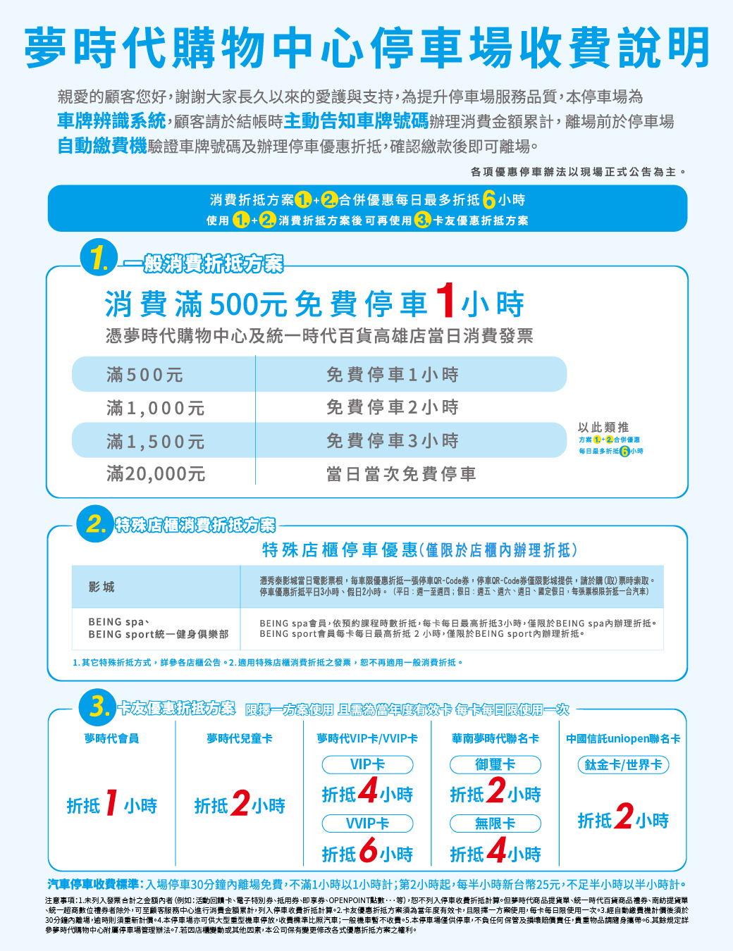 - 每次停車,當日累計消費折抵金額達20,000元以上者,可享當日免費停車優惠。未列入發票合計之金額内者(例如:活動回饋卡、電子特別券、抵用券、即享券、OPEN POINT點數…等),恕不列入停車收費折抵計算。但夢時代商品提貨單、統一時代百貨商品禮券、南紡提貨單者除外,可至顧客服務中心進行消費金額累計,列入停車收費折抵計算。